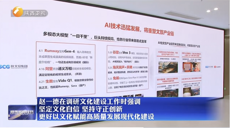 省委书记赵一德在调研陕文投集团时强调:坚定文化自信,坚持守正创新,更好以文化赋能高质量发展现代化建设。重点听取了华为 x 陕文投集团共同探索打造文旅行业示范项目,建设文旅高质量数据集,构建 AI 文旅垂直大模型,开展"AI +文旅"试点应用,推进人工智能技术在文旅行业的深度融合等汇报。随后,赵一德察看华为·陕文投文旅人工智能联合创新中心、“游陕西”公共服务平台、旅游资源交易平台等运行情况。他指出,以数字化、网络化、智能化为特征的文化和科技深度融合是大势所趋,要善于运用互联网思维和信息技术改进文化创作、生产、传播流程,以数智赋能“文学创作—舞台戏剧—影视制作—场景体验—文旅综合”全链条发展,切实把陕西省文化资源优势转化为文化发展优势。
