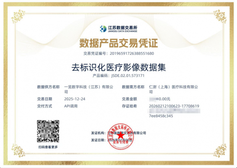 2月12日,华风数润在江苏数据交易所完成去标识化医疗影像数据集场内交易。这不仅是一笔成交,更是一次路径验证——在合规去标识化、标准化结构与可追溯机制支撑下,医疗数据以产品形态实现合规出域流通。长期以来,医疗数据难以规模化流通。本次交易表明,去标识化数据产品已具备进入公开市场的能力。对AI而言,这意味着数据供给正在从项目制走向产品化与持续供给机制。